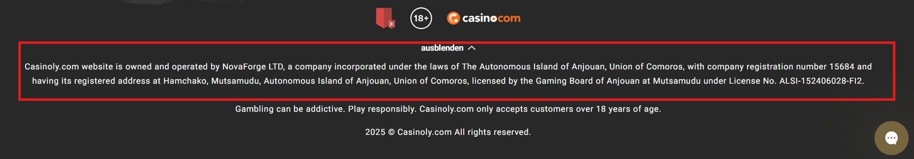 Casinoly wird von NovaForge LTD mit einer gültigen Casino-Lizenz betrieben, welche transparent im Impressum eingesehen werden kann. Der Betreiber steckt auch hinter Plattformen wie PlayZilla oder StoneVegas, von denen nach unseren Erfahrungen keine Betrugsfälle bekannt sind.